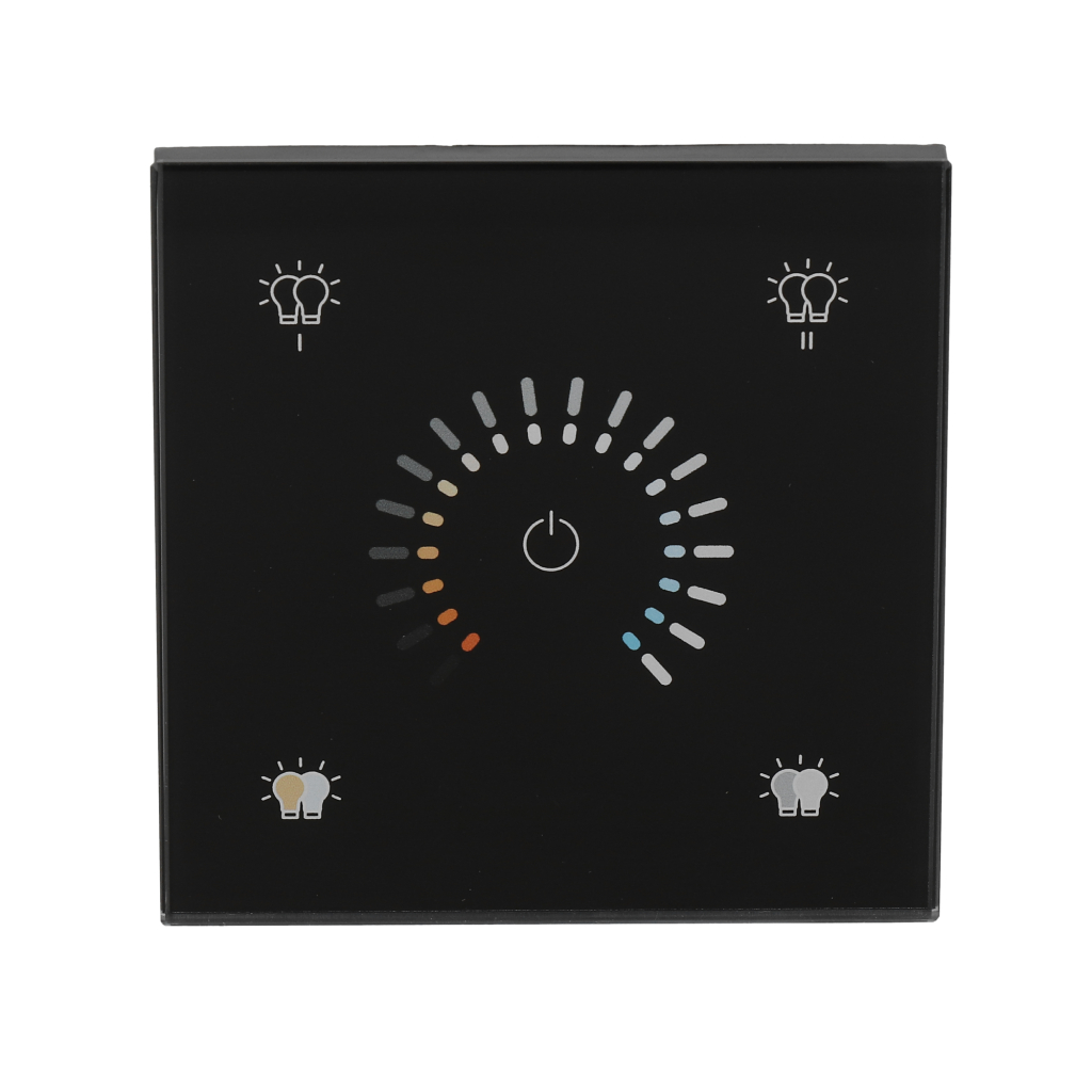 Panel, wyposażony w pięć dotykowych przycisków oraz okrągły suwak, umożliwia precyzyjne załączanie, wyłączanie oraz płynną regulację natężenia oraz barwy oświetlenia. Idealny przy sterowaniu dwoma grupami lub dwoma scenami opraw DALI. Dodatkowo diody LED sygnalizują wybraną funkcję suwaka oraz stan wysterowania poszczególnych grup lub wybranej sceny, co znacząco podnosi komfort obsługi.